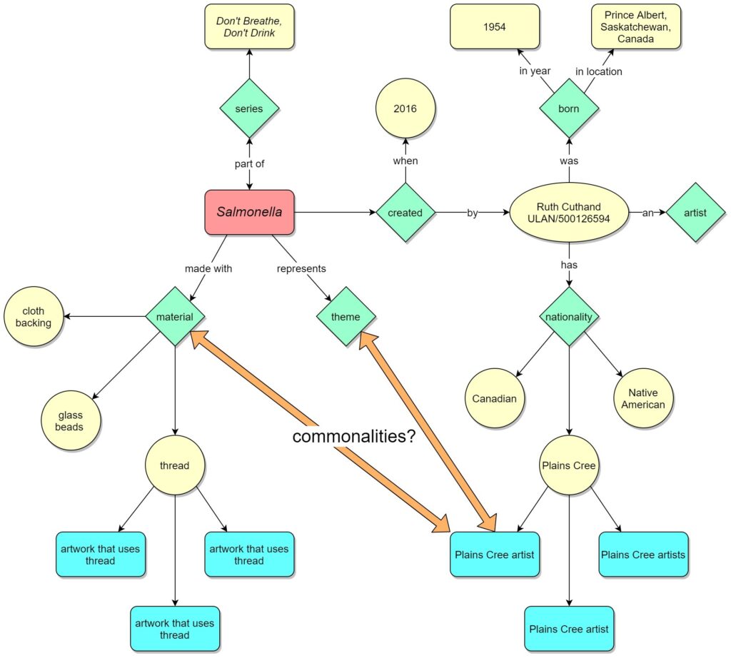 For example, if a researcher was looking for objects made with glass beads, they might come across Salmonella (from the Don’t Breathe, Don’t Drink Series) by Ruth Cuthand currently held by the University of Saskatchewan. Researchers could then choose to create a kind of web-like graph built of nodes and facets, known as a knowledge map, based on common materials and connect this object to other objects that also use thread as a material. This web could be expanded to include the creators of those objects made with thread. The researcher could also easily look at other linked examples of Cuthand’s work and access the artist’s URI in the Getty Union List of Artist Names (ULAN) to find out more about the artist—as long as the artist has been minted as an entity. On her Getty entity page, a researcher will find Cuthand’s birth place, year, and that she identifies as a Plains Cree person. Since this data is also provided as LOD, researchers could then create a map of late twentieth-century Plains Cree artists and perhaps look for commonalities in their materials or in the location of their objects. Potentially, researchers could even look at what Cuthand has to say about her own work, and build further connections with other artists based on thematic ideas and concepts—if the data is linked. However, when online catalogue information is limited to title, artist, and date, the opportunity for creating meaningful connections and finding serendipity with LOD can be limited.