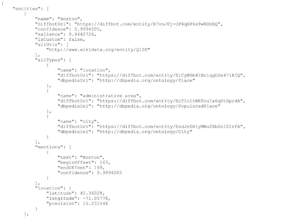 Starting with plain text as input, the workflow sends a request to Diffbot to identify all of the entities and facts in the text. The response that comes back looks something like this: