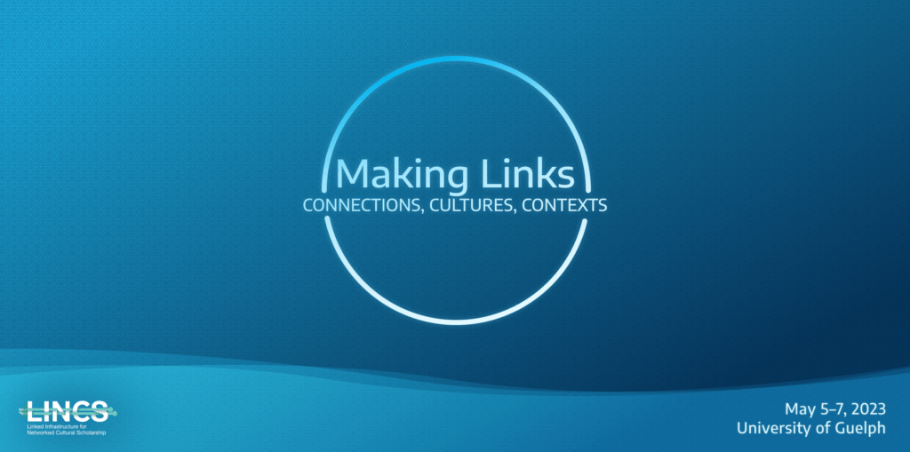 The Making Links: Connections, Cultures, Contexts conference (May 5-7, 2023 at the University of Guelph) addresses a wide range of topics relevant to creating and using linked data for research on cultural scholarship and cultural memory in the Canadian context and beyond. It marks the beta launch of the Linked Infrastructure for Networked Cultural Scholarship (LINCS) suite of tools for the creation, exploration, and use of linked open data.